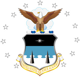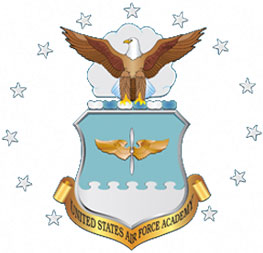 The Air Force Academy crest; created by Brig Gen Robert F. McDermott, Dean, in 1963: The emblem is symbolic of the Air Force Academy. Against a shield divided horizontally into three sections, white representing clouds, brilliant blue representing sky, and black indicating outer space, two geometric forms symbolic of the upward motion of flight and the dual mission of Educational Development and Training for Military Leadership point upward to the North Star symbol which represents the ultimate achievement.